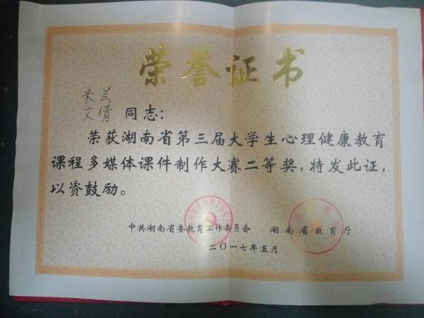 近日,由湖南省教育厅主办的湖南省第三届大学生心理健康教育课程多媒体课件制作大赛决赛在长沙理工大学云塘校区举行,来自全省各大高校的35个团队进入了决赛。经过激烈角逐,我院米兰、文倩两位老师的作品以其精致的课件制作、新颖的教学方式方法和精彩的现场讲解收获了评委和同仁们的好评,以总分第二名的成绩喜获二等奖。